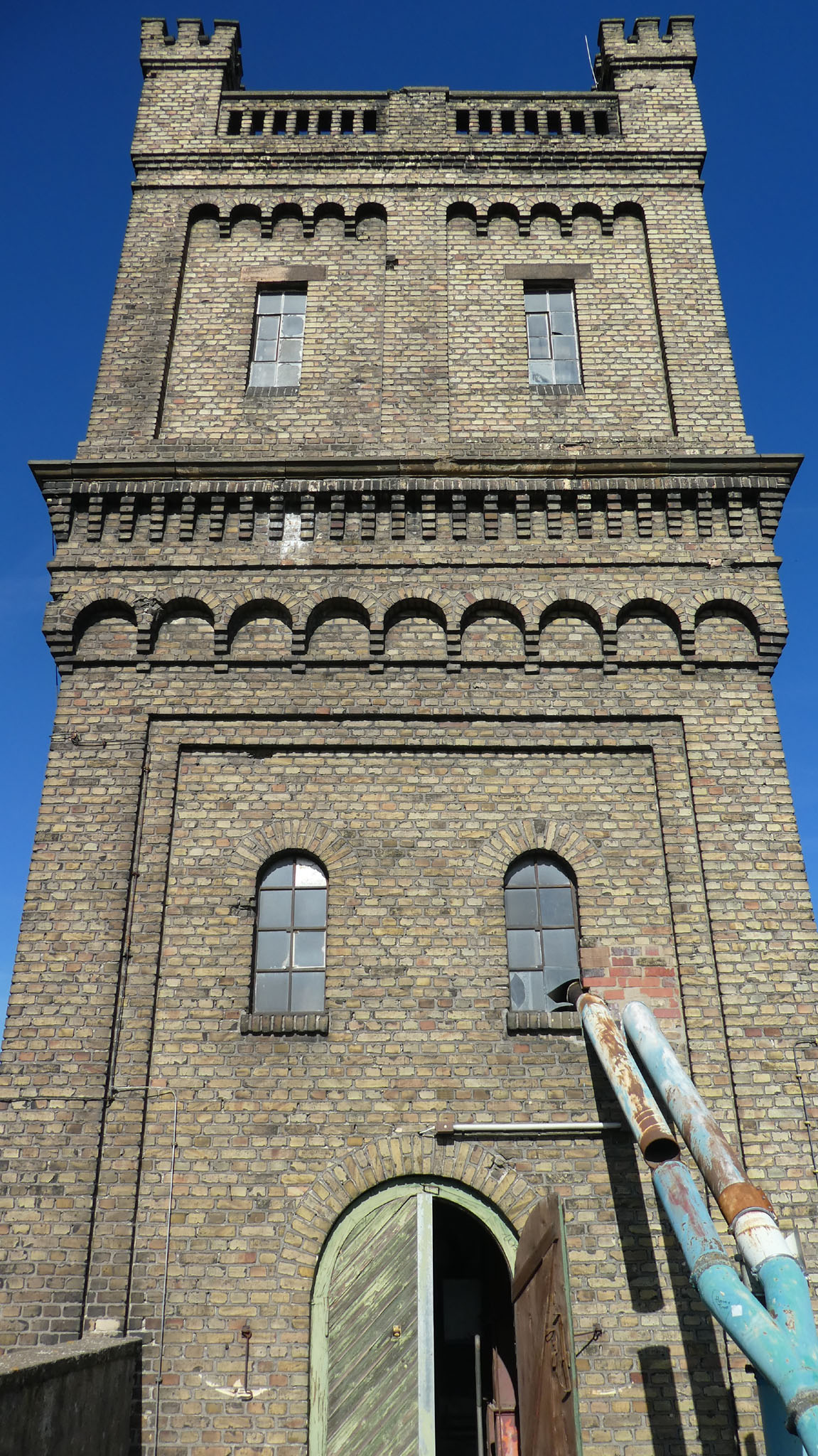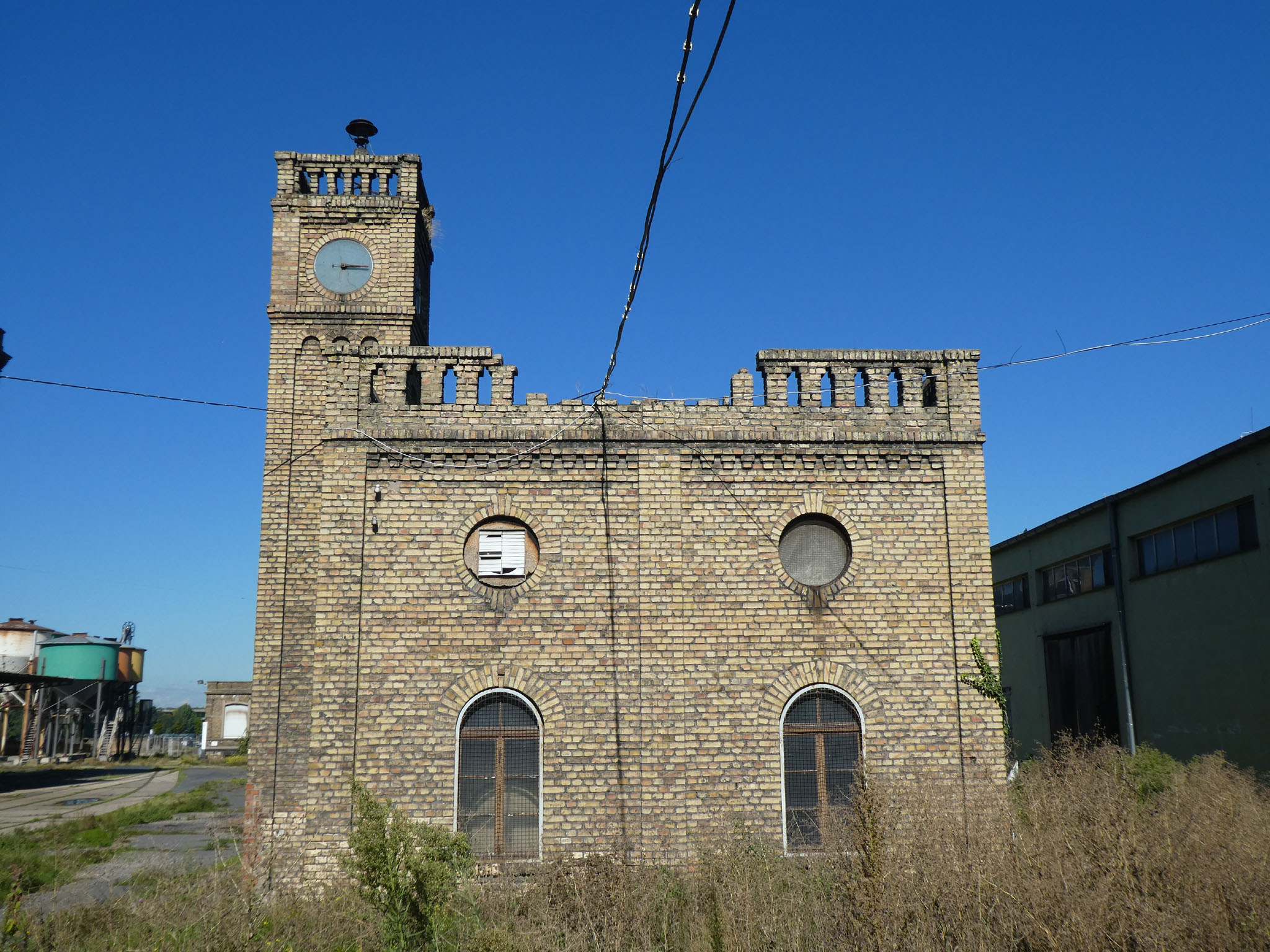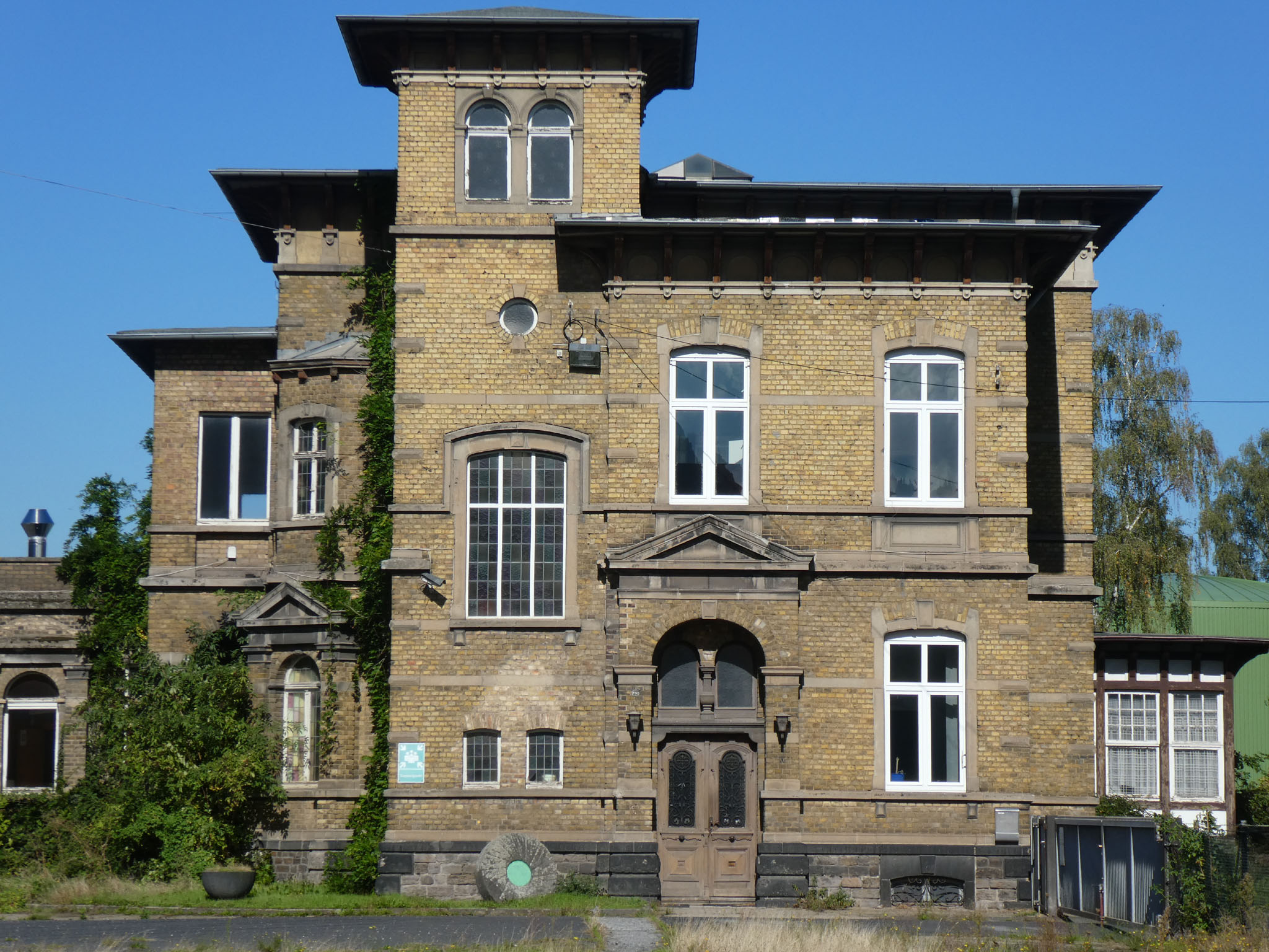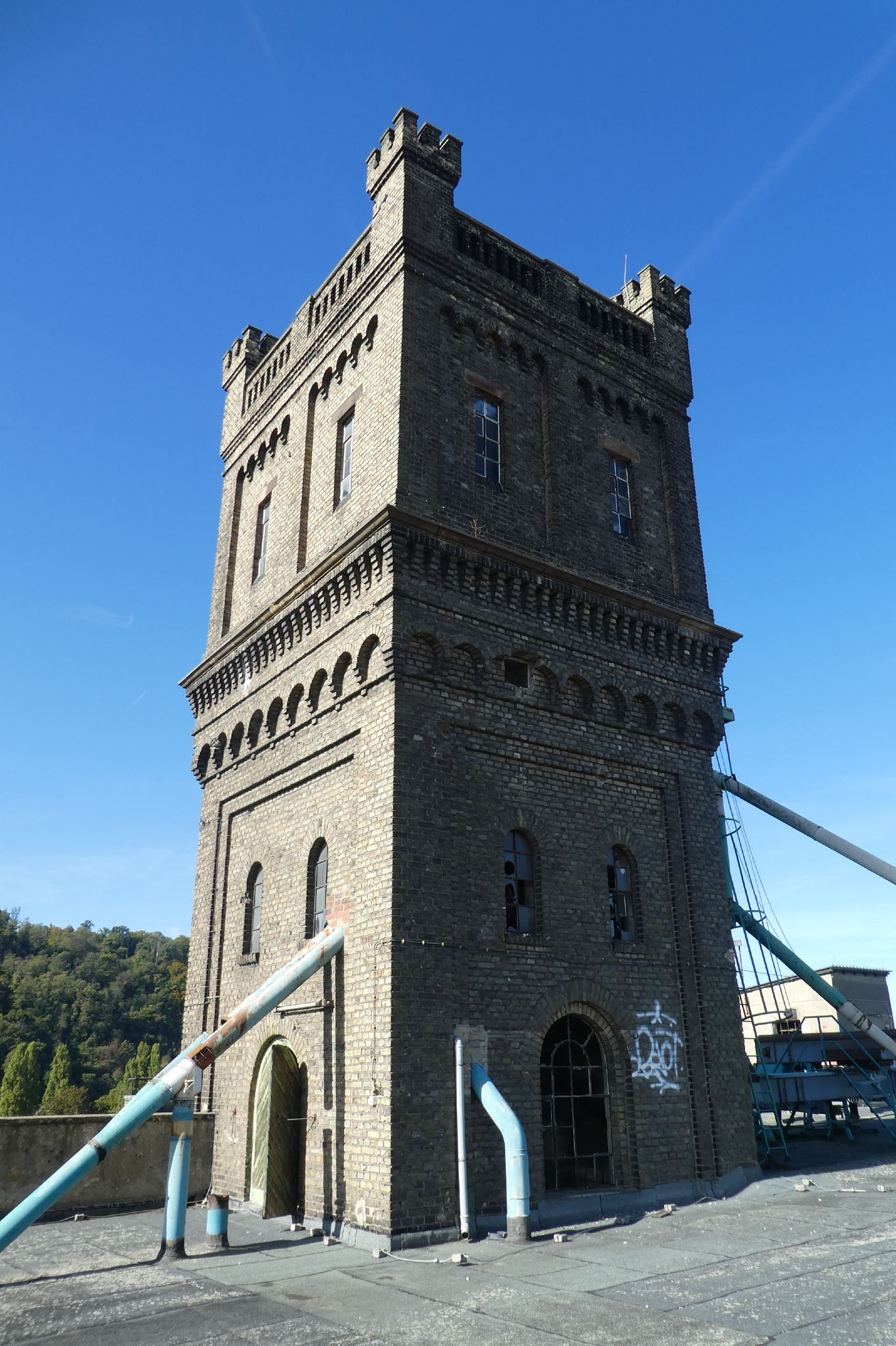 Die seitlichen Flügel verfügen zwar ebenfalls über 15 Achsen, doch ist hier die Achsenstellung viel dichter, so daß diese Bauten kürzer als die Hauptfront sind. Stromaufwärts ist an das Hauptgebäude ein weiterer Bau angefügt, von gleicher Höhe, jedoch nach Osten einspringend, der ein Achsenverhältnis von 3:7 aufweist. Im Winkel zwischen Haupt- und Nebenbau erhebt sich ein schlanker quadratischer Turm, der die gesamte Gebäudegruppe um zwei Geschosse überragt und mit vier durch Zinnen geschmückte, zwischen steinerne Geländer gespannte Ecktürmchen abschließt, deutliche Anlehnung an mittelalterliche Feudalarchitektur. Der für den Produktionsablauf notwendige Turm soll durch sein Dekor zum Symbol unternehmerischer Leistung werden.