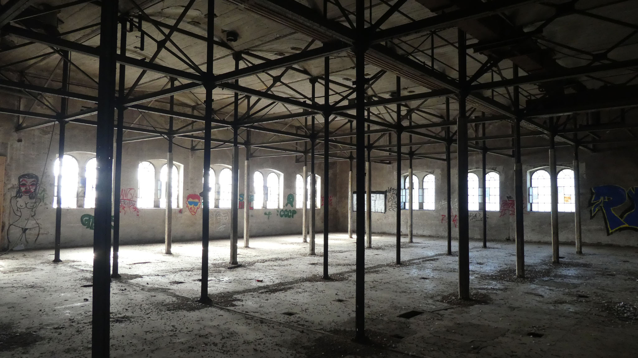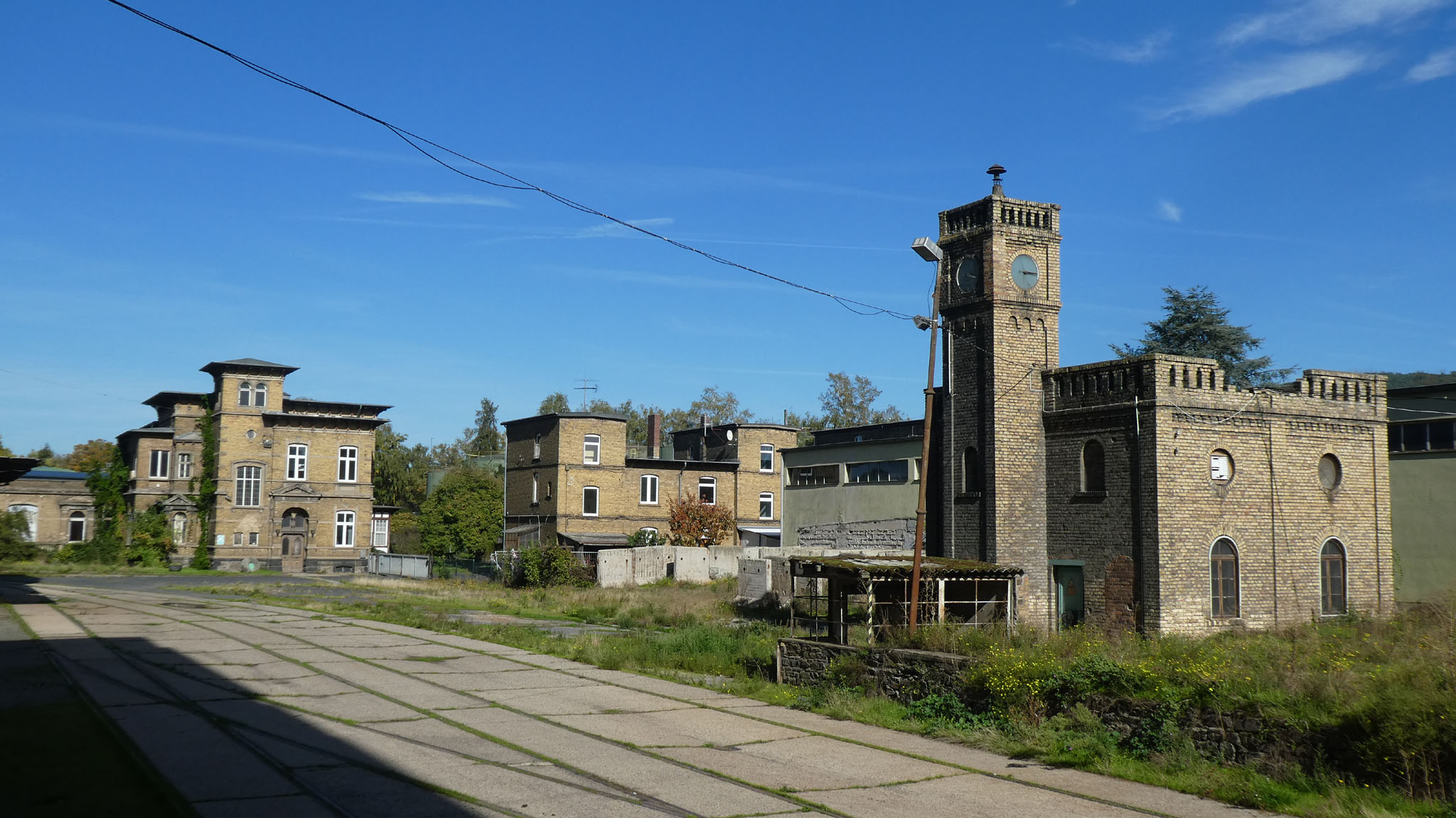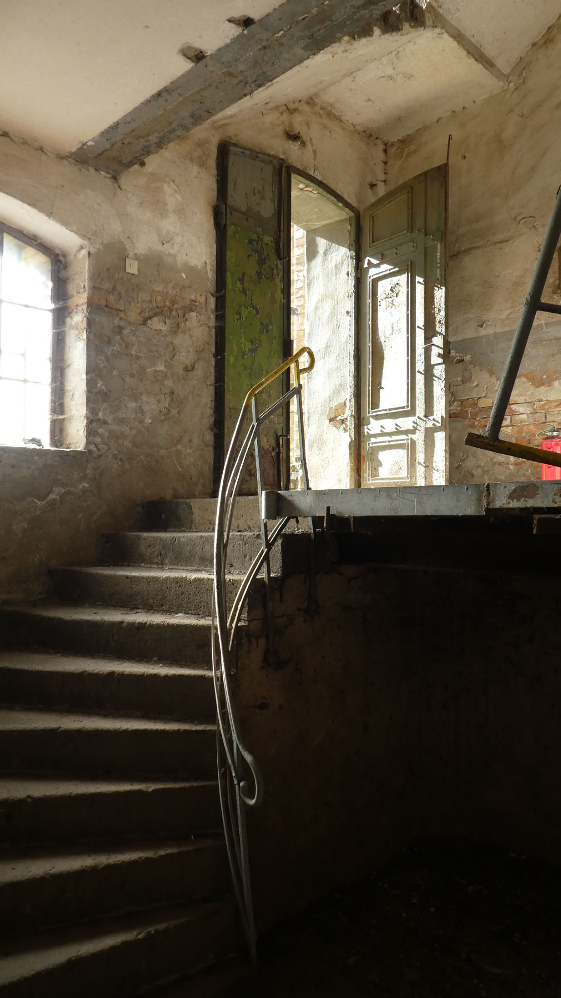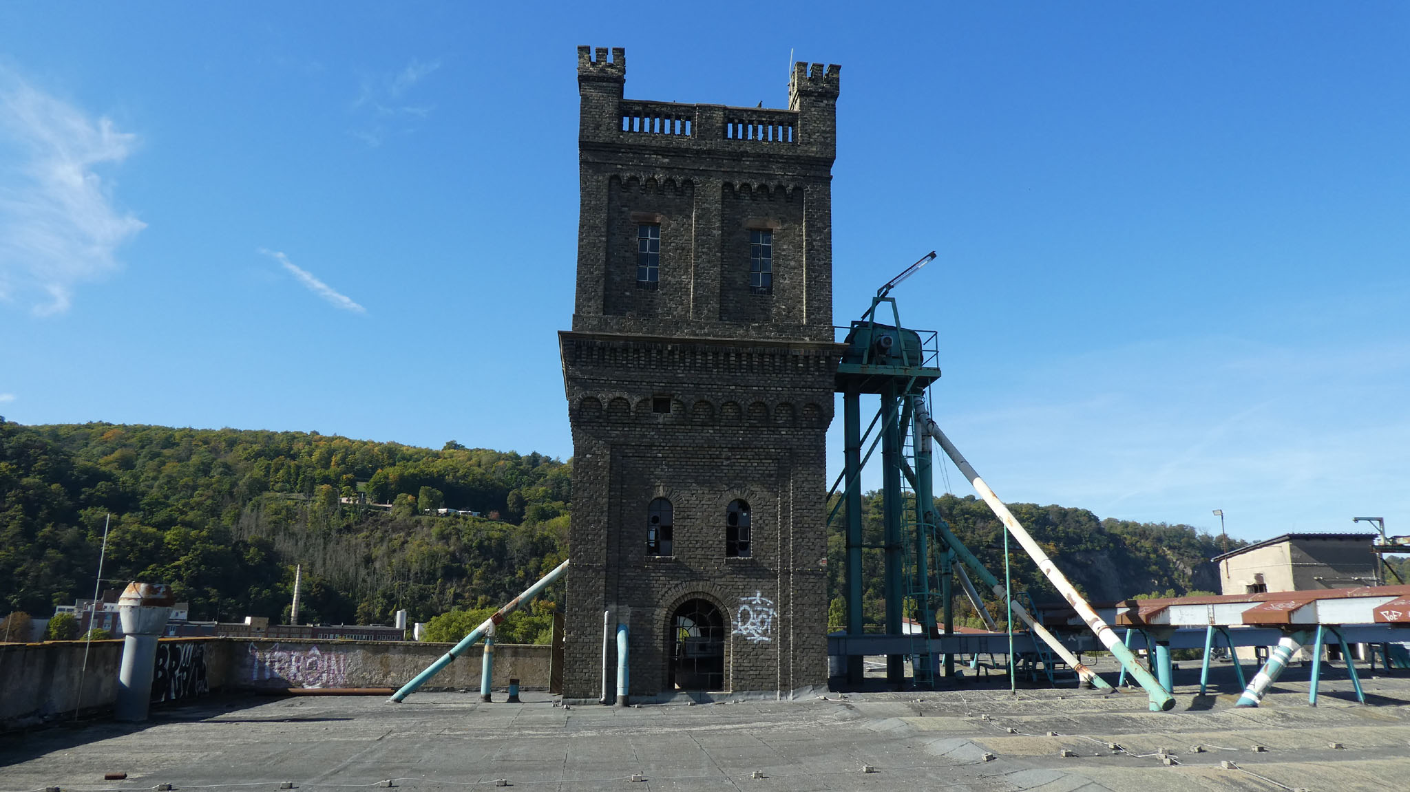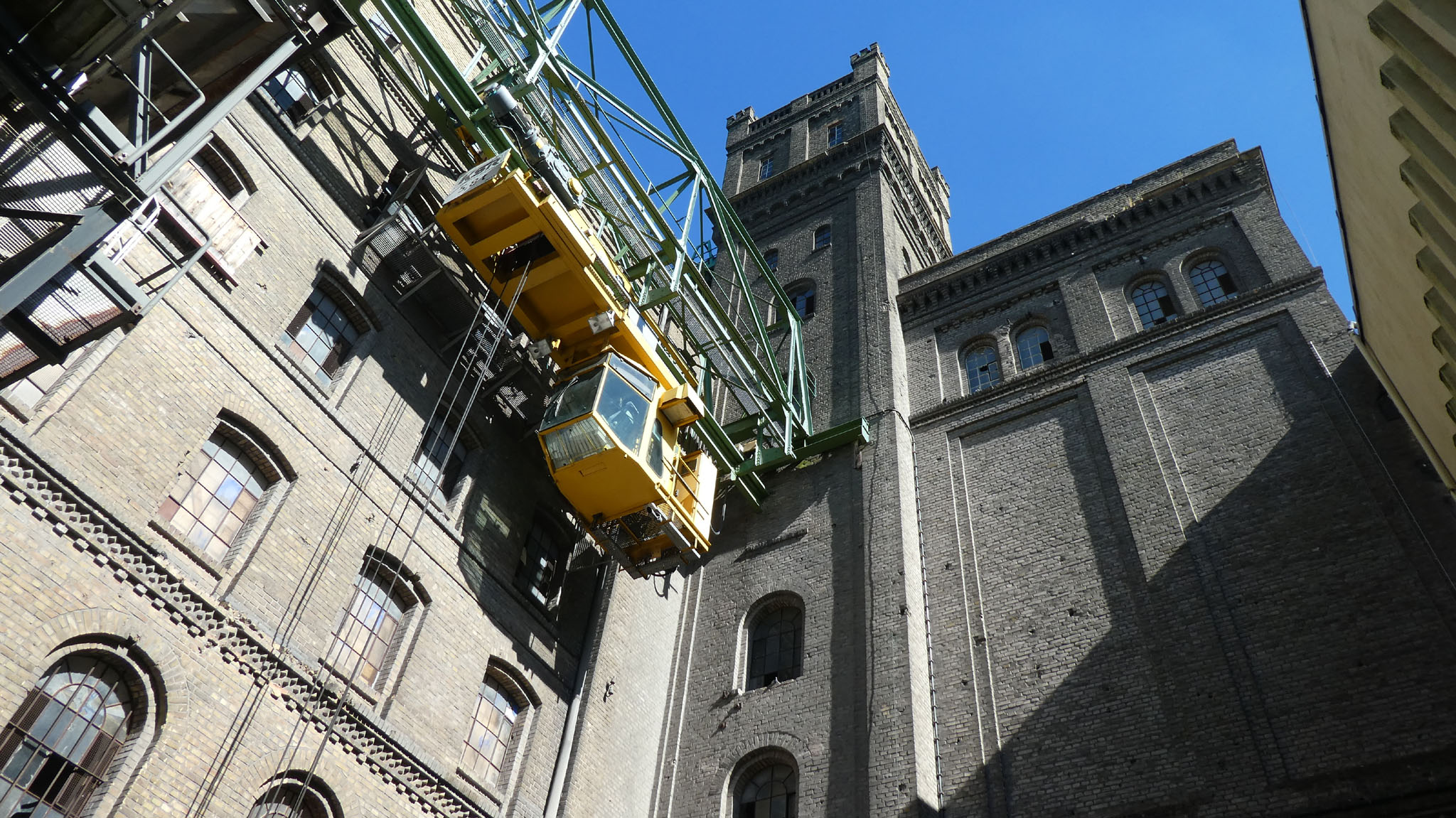 Die seitlichen Flügel verfügen zwar ebenfalls über 15 Achsen, doch ist hier die Achsenstellung viel dichter, so daß diese Bauten kürzer als die Hauptfront sind. Stromaufwärts ist an das Hauptgebäude ein weiterer Bau angefügt, von gleicher Höhe, jedoch nach Osten einspringend, der ein Achsenverhältnis von 3:7 aufweist. Im Winkel zwischen Haupt- und Nebenbau erhebt sich ein schlanker quadratischer Turm, der die gesamte Gebäudegruppe um zwei Geschosse überragt und mit vier durch Zinnen geschmückte, zwischen steinerne Geländer gespannte Ecktürmchen abschließt, deutliche Anlehnung an mittelalterliche Feudalarchitektur. Der für den Produktionsablauf notwendige Turm soll durch sein Dekor zum Symbol unternehmerischer Leistung werden.